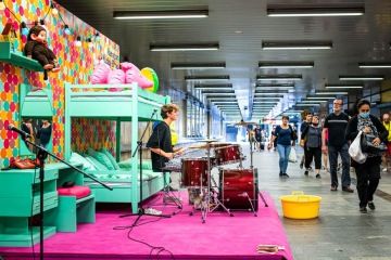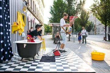 Z Moraváku jdu za roh na Jakubák, kde už válí na kytaru v ordinaci polský busker Mariusz Goli. Pódia v podobě vtipných kulis pokojů rozsetá po ulicích centra už tři roky k festivalu nezapomenutelně patří. Na svědomí je má výtvarnice Kateřina Šedá a letos k ložnici, obýváku, koupelně, dětskému pokoji a garáži přidala covidově tematickou ordinaci. Přemýšlela, jak buskery dostat do Brna a udělat jim to zábavnější, a myslím, že se jí to rozhodně povedlo!