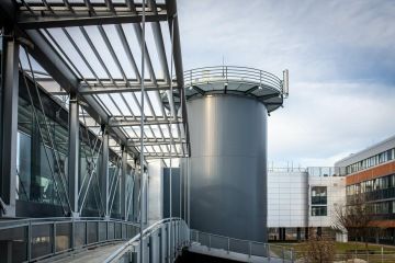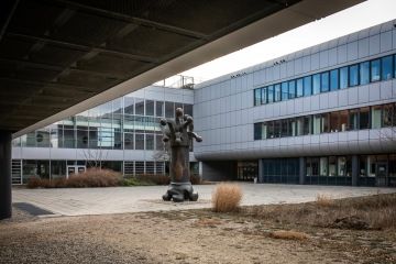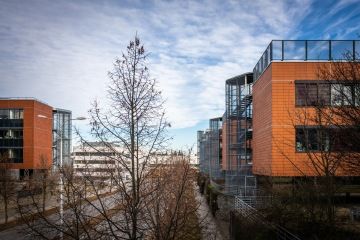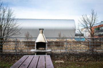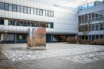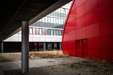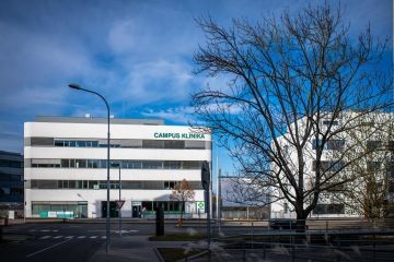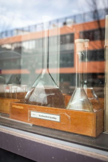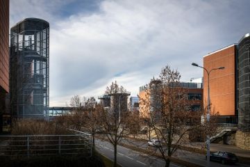 Campus v Brně vedle fakultní nemocnice v Bohunicích vyrostl v roce 2010, když jsem ještě byla v tramtárii. Dojet se sem dá autobusy a trolejbusy (než začne premávat nově prokutaná šalina), ale já se tu vynořila z lesnaté stezky vedoucí z Kamenky. Nevím, jaký je tady studovat (přírodovědu, sportovní vědu či lékařství), ale procházet tudy je esteticky povznášející. Narazila jsem na pár soch, i na grilovací místa, kádinky za oknem či maxi periodickou tabulku prvků na dlažbě dvorany. Červené koncovky areálu potěšily!
