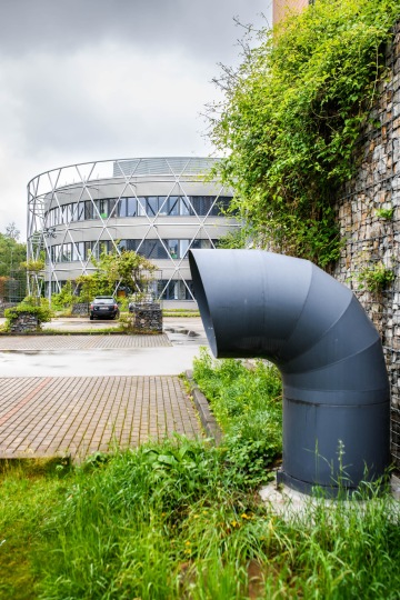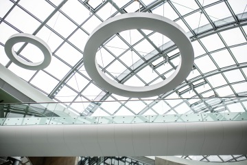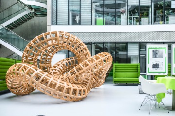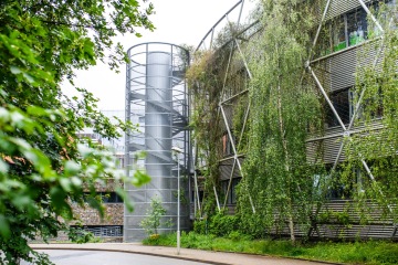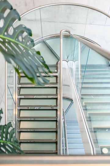 Ocenila jsem, že architekti šli ruku v ruce s revoluční vědou, a tak posunuli hranice statikům, kteří považovali navržené samonosné schodiště za nemožné. Nemělo by překvapit, že popínavky už vyrazili vzhůru k výšinám po konstrukci obepínající ovál a že před budovou roste právě kvetoucí pažitka a máta.