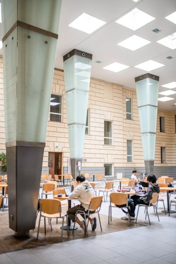 Červený mostový jeřáb je spojený přímo s budovou, to proto. A mimochodem, profesorem tu byl i Viktor Kaplan, tedy vynálezce Kaplanovy turbíny. Jeden čas tu sídlila lékařská fakulta, a tam, kde je teď bufet, býval sklad toxického zdravotního materiálu. Tam kde je teď atrium se studovnou býval dvorek s parkovištěm. Věděli jste, že studenti žurnalistiky tu mají svoje Rádio R, které je největším studenstským rádiem ve střední Evropě a naladit si ho můžete tady?
