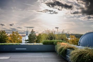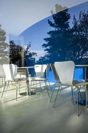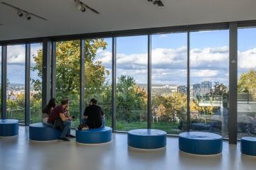 Uvnitř vás obejme vlídný otevřený prostor, kterému vévodí výhled na severní část města a bílý interiér kombinovaný s kobaltovou modří. Důmyslná je tu nejen architektura, ale i technika sloužící v jejím nitru. Návštěvníka tu navíc nezkásnou hned u vchodu a každý si může projít celou budovou od podzemního exploratoria s mlhovinami až po střešní terasy. Jen tak.