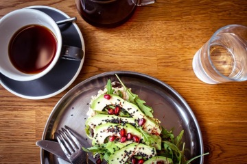 Láká mě ovesná kaše s mákem a sušenými švestkami, ale nakonec hlad zaháním rozpečeným kváskovým chlebem s humusem a avokádem sypaným sezamem, rukolou a jadérky z granátového jablíčka. Zapíjím filtrem z Kostariky. O sobotním brunchi se podává třeba lilkové ragú s francouzskou čočkou, bylinkové fazole nebo pečená dýně s tahini. Perlí i s višňovými dukátovými buchtičkami nebo smaženými vdolkys borůvkovou omáčkou.