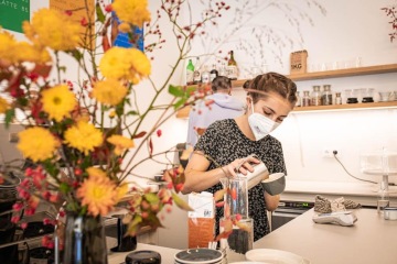 Trefné je umístění trouby vedle kávovaru, a tak Zuzana či její kolegyně můžou hbitě vyměnit páku kávovaru za váleček, aby přímo před hosty vyválely těsto na koláč. „Zákazníkům nejvíc chutná náš čoko-arašídový koláč a taky buchty honzovky hned zmizí,“ líčí Zuzana, která připravuje jen veganské receptury. Nikde to tu nekřičí, protože to mnohdy zákazník ani nepozná.