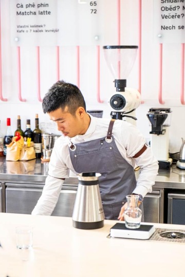 Večerka je tím, čím chcete. Kavárnou, bistrem i barem. Fungl novému místu jsem věnovala tři návštěvy, abych ochutnala snídani, oběd i drink s asijským šmrncem a musím říct, že laťku se jim povedlo držet ve všech disciplínách. Ze zvědavosti ochutnávám exotickou kávu Ca Phe Phin z vietnamské robusty s kondenzovaným mlékem, ale příště už zůstanu zase u filtru. Kávu berou od berlínských The Barn, a protože tu detaily berou vážně, tak tu má bílou barvu nejen kávovar, ale i konvička nebo páková baterie. Tomiho tu potkávám výhradně v bílé košili, přičemž rukávy má sepnuté přes paže gumkou v barvě sladěné s řemínky zástěry. Ty si samozřejmě nechali šít na míru a musím uznat, že je to asi nejelegantnější uniforma baristy, jakou jsem u nás viděla.