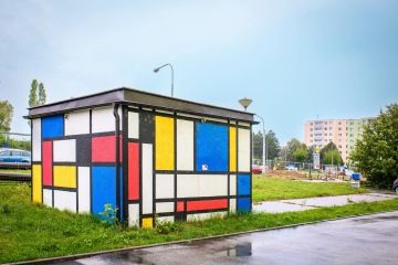 Jenže já pé cestě v Bohunicích natrefila ještě na jeden úkaz. Na trafačku zahalenou do slavného abstraktního Mondrianova obrazu. No, myslím, že tím v Brně nekončíme.