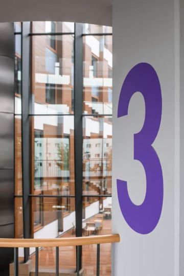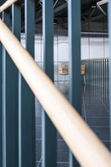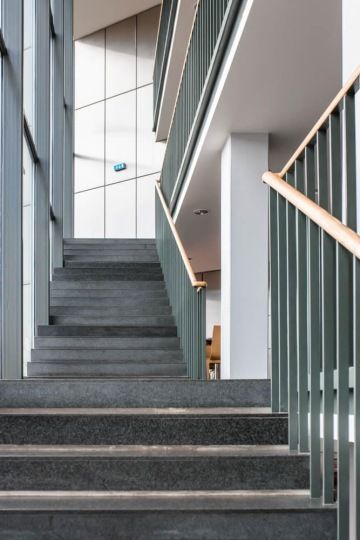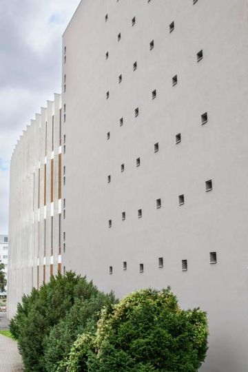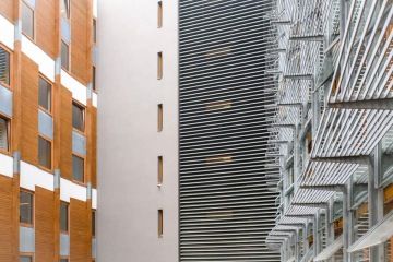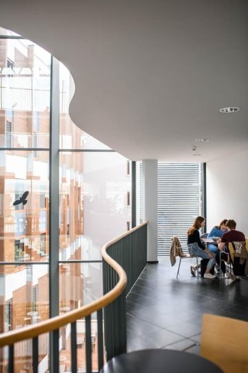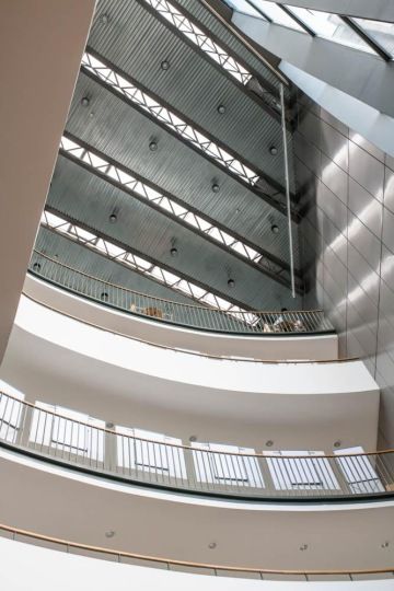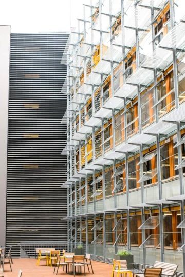 Knižnímu archivu stačí v zadní části skromná šedá zeď a malá průduchová okénka, která však neposedně vybočují z linky. Různorodost stavby si jde nejlépe ohmatat v otevřeném atriu přístupném ze druhého patra. Tady můžete studovat pod otevřeným nebem.