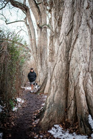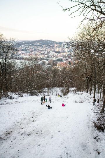 Vydejte se kolem řeky proti proudu ke splavu. Pak vás cesta hodí na chodík, projdete podél Vesláku a za odbočkou přes most u zastávky opět zamiřte lesní pěšinou podél vody. Možná budete mít bahno až za ušima, ale má to atmošku. Já chytla modré nebe, sluncem rozpálené listy ve sněhu a horké pití v Café Louka (za jundrovským mostem). Pak jsem to otočila po druhé straně řeky a přes Wilsoňák alou zpátky na Staré Brno.