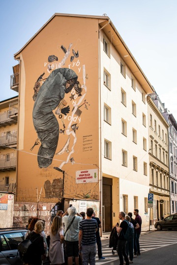 Vyslechla jsem zákulisní příběhy i doprovázející problémy, které to obnášelo. Tu se začalo odlupovat nekvalitní zdivo, když se umělec dotkl stěny, tu si to někdo, kdo dával potřebný souhlas, v den malby rozmyslel. Jinde se zase nedalo k fasádě dostat technikou se zdvižnou plošinou a bylo potřeba mnoho kroků než se vše podařilo. Klobouk dolů za trpělivost a dotažení!