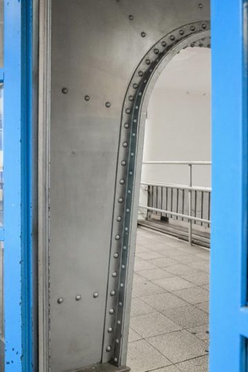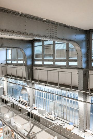Hned za vstupem se můžete pokochat výtahem páternoster, který neúnavně jezdí nahoru i dolů. Po loňském incidentu, kdy si do něj babička zaklínila nohu a zůstala viset hlavou dolů, to perpetum mobile raději vyřadili z provozu. Doporučuju pokračovat do prvního patra lemovaného ladnou křivkou skleněné vstupní stěny. To hlavní, co je možné v hale z galerie obdivovat, jsou ocelové nosníky plné vyboulených nýtů. V interiéru jsou přiznané a dost jim to sluší.