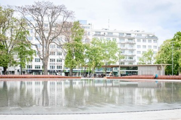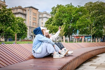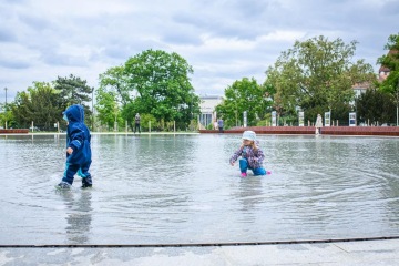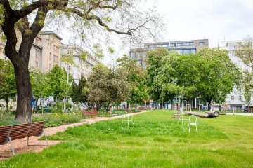 Když odlepíte oči od vegetace, o pozornost si říká bezbariérový „bazének“, kterým probíhají s neřízenou radostí děti i psi. Ta radost je nakažlivá, takže se nemusíte sami ani v té vodě cachtat. Culíte se už jen při pohledu na dítko, které pod dozorem osvícené maminky odděno do neoprenových vrstev, ve vodě dovádí. Vodní plochu, která se může změnit do fontán, mlžných trysek nebo divadelního podia, obkroužila parádní proměnlivá dlouhatánská lavice. Jo, kolem parku furt vedou rušné silnice, ale to místo neskutečně prokouklo a je důkazem, že s vlídností veřejného prostoru se dají dělat divy.