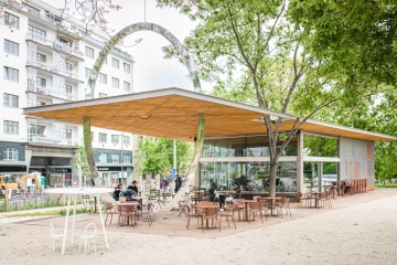 Na to všechno dohlíží opodál nová kavárna PARQ s elipsovitým detailem a veřejnými záchodky. Aby toho nebylo málo, v trávě se tu a tam vyloupnou nevšední herní prvky v podobě stolků a židlí. Vtipně si s nimi vyhrál výtvarník Richard Loskot a ta lupa do korun stromů, kterou najdete, jen když se ohnete do dětské velikosti, je boží. Jak se dají židle a stoly pojmout tak, že z nich vzejde altán, kolotoč, skluzavka nebo ovce (!), se musíte přijít přesvědčit už sami.