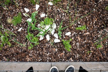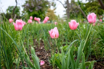 Zaujalo mě, jak krajinářská architektka Klára Zahradníčková mluvila o tom, že kořenový systém provětrali a s péčí dělníků ochránili při stavbě cest. Změnilo se toho tolik a je to tak různorodé! Tu je tráva nižší, tam zase vyšší jako na louce. Bílé tulipány právě donaha shodily okvětní plátky a pomněnky zvědavě prokukují oky plotu. Cesty mají podle svého významu různý povrch a potěšily mě dlaždice prorostlé trávou. Ty nelegální stezky samozřejmě nechali, protože mají pádný důvod J Své místo tu mají též pravidelně zaplavované záhony a využití najde i dešťová voda.