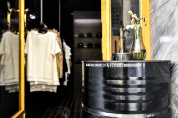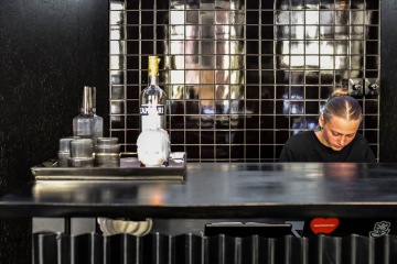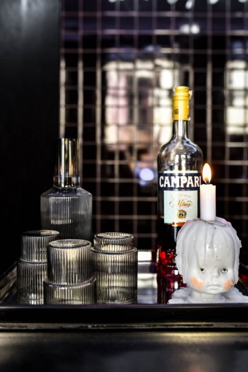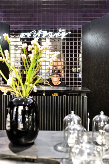 Černé dlaždičky na podlaze i stěnách. Černé radiátory. Černý vlnitý plech. Černý barel před vchodem. A samozřejmě převážně černé oblečení. Taky neon, který do toho všeho křičí název podniku. K tomu flaška campari na pultu a vysoký strop se zdobnou štukou.