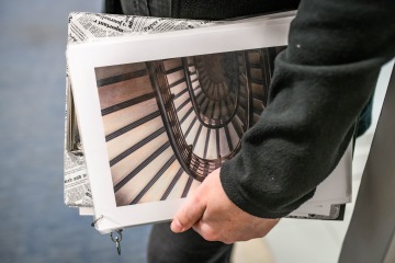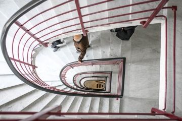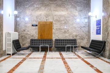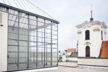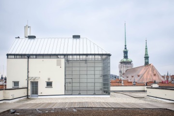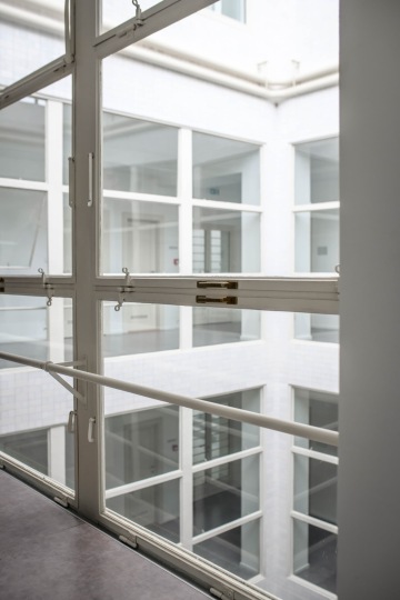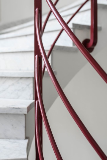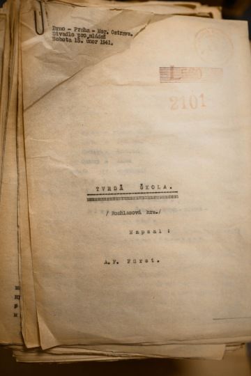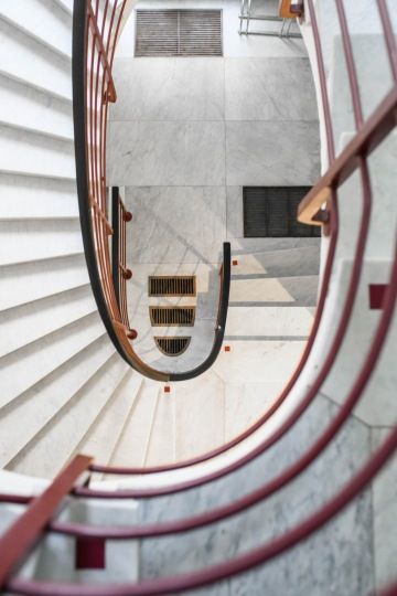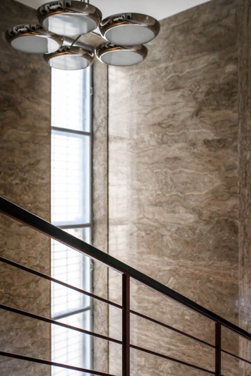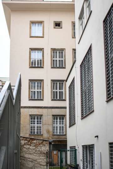 V době, kdy architekt Ernst Wiesner funkcionalistickou budovu navrhl, mu bylo teprve 31 let. Známý je svými schodišti a tady je jich hned několik. V tom centrálním nechybí samozřejmě světlík s původními kachličkami. Stojíme v chodbě s kancelářemi a představuju si, jak tu za kliky kdysi brávali básníci Skácel či Mikulášek a jak tudy chodil Karel Höger, jehož nezapomenutelný hlas se vtiskl do mnoha rozhlasových her. Podlaha je na spoustě míst mramorová, neboť budova byla stavěna původně pro Union Banku. Komunismus buržoazní materiál přikryl linoleem, které v kameni zanechalo žluté skvrny.