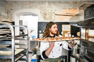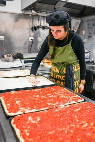 Pekařka Nikol má plné ruce práce s dozdobováním focaccii a pak ji porcuje nůžkami, přičemž v ruce má i metr. „Kdybych to krájel od oka, jak jsem zvyklý z Itálie, byly by řeči. Češi jsou hodně přísní. Naučil jsem se vzít metr, aby každej dostal stejnej kus,“ culí se Antonio.