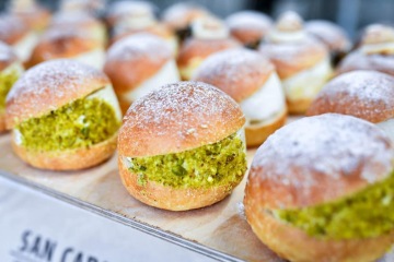 U chlazené vitríny se zahledím na dalšího česko-italského křížence ‚loupakoule‘, což jsou bochánky z loupáčkového těsta plněné směsí ušlehané smetany s mascarpone. „Dneska je máme s kávou, s pomerančovou kůrou, nugátové, s amarettem a nejvíc jdou pistáciové,“ vyjmenovává Antonio, kterému pomáhá italské suroviny vybírat jeho náročný italský tatínek. Mimochodem i ten tu v sedmdesáti letech přiložil ruku k dílu, když prostor nové pekárny vymaloval.