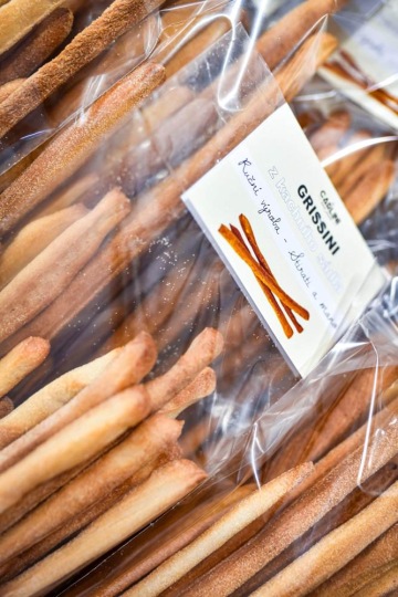 Tím však čáry v nezvyklé pekárně nekončí. Jejich mistrovským kouskem jsou i tradiční turínské tyčinky grissini. Původně se do nich dávalo vepřové sádlo, ale dnes se výrobci většinou spokojí s olejem. Byla to Michaela Carlini, která sáhla do svého maďarského chuťového arzenálu a přišla s nápadem použít sádlo kachní. V pekárně je připravují jedenkrát týdně, kdy ručně musí natáhnout 1500 kousků těsta do nadýchaných křupavých tyčinek. „Jsou skvělé na svačinu jen tak s kouskem salámu nebo sýra. Taky jako špunt po jídle. Nebo si k tomu otevřete vínečko. Včera jsme jich dělali 30 kg a hned to bylo všechno pryč na rezervace.“