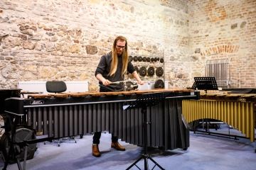 Klenbový sál má surové cihlové stěny a je dobrých 10 metrů pod povrchem chodníku. Vyráží mi dech. Učí se tu hrát nejen na bicí, ale i gongy, tam tamy, tamburínu, kastaněty či kravské zvonce. Zrovna tu cvičí dva mladíci a nemůžu se odtrhnout od jejich tašky, ze které vykukují desítky rozmanitých paliček. „Jů, to je jako z pohádky!“ vyjeknu, když mi zahrají na vibrafon.