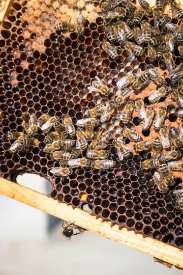 Když Tomáš vytáhne z útrob úlu první dřevěný rámek, které jsou tu k mému překvapení ne vodorovně ale svisle naskládané jeden vedle druhého, plástev má celou zaplněnou medem. Nemůžu se vynadívat na tu důmyslnou krásu. Plástve jsou postavené z vosku a skládají se z šestiúhelných buněk, kde je jedna jako druhá. V úlu se používají nejen jako skladiště medu a pylu, ale také jako kolíbky na vajíčka. Jak si později všimnu u dalších rámků, nemusí být plástve dostavěné až do krajů. Tomášově pobídce, že do plástve můžu zabořit prst a ochutnat med, se nejdřív zdráhám. Když mě ujistí, že to nevadí a včely jsou schopné to za pár hodin dostavět, s dětskou zvědavostí probořím ukazováčkem voskový povrch a následně ho labužnicky olizuju. V medu jsou jednoduché cukry, které nepotřebují být rozštěpeny enzymy.