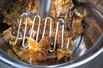 Dozvídám se, že česká legislativa rozlišuje jen med květový a medovicový, což se měří podle elektrické vodivosti medu. Květový med je z nektaru květů, medovicový je vlastně ze mšic. Protože ty žijí hlavně na jehličnatých stromech, říká se mu běžně med lesní. V barvě bývá tmavší a u konzumentů je prý žádanější než med květový. „Před pár lety jsme doma v Beskydech vytáčeli lesní med a ten byl jak asfalt, úplně černý a moc dobrý,“ vzpomíná Tomáš. Na rozdíl od tatínka a dědy, svůj med nestáčí, ale lisuje. „Plástve medu z rámečků se vyříznou a ve standardní nerezové nádobě pomocí maxi šťouchadla na brambory rozšťouchají. Tak se to nechá den dva odstát a díky tomu, jak je med hustý, tak všechny voskové zbytky vyplavou na hladinu. Ty se seberou a zůstane čistý med. Na rozdíl od stáčeného medu, při této metodě nezůstanou voskové rámečky a včely si je musí postavit znovu. Myslím si, že je to pro včely lepší a přirozenější.“