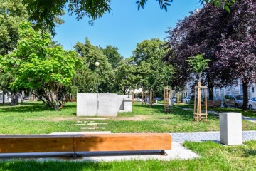 New sidewalks, new wooden benches, new trash cans and a new monument to Adolf Loos. It is conceived as a concrete sculptural form of his tombstone in the Vienna cemetery, divided into four pieces, which Loos, by the way, designed himself two years before his death.
