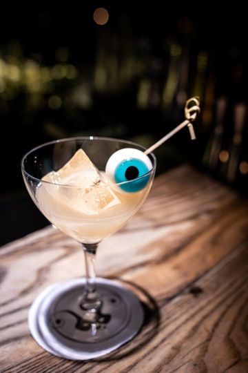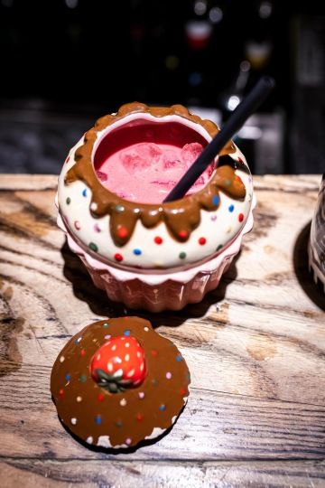 Pod drinkem s názvem Laktační poradkyně se skrývá červené víno s pims likérem a klarifikovaným kakaem. Růžový, sladký, hustý drink v porcelánovém dortíku s názvem Větrník na uzdě je připravený z malinového pyré, arašídové zmrzliny, metaxy a griotky a na vlastní oči ho tu vidím pít z brčka kluka. Veledílem servírovaným v porcelánové lebce je pak Krojovaný paganismus, což je slivovice infuzovaná s uzeným špekem, s citronem a žloutkem.